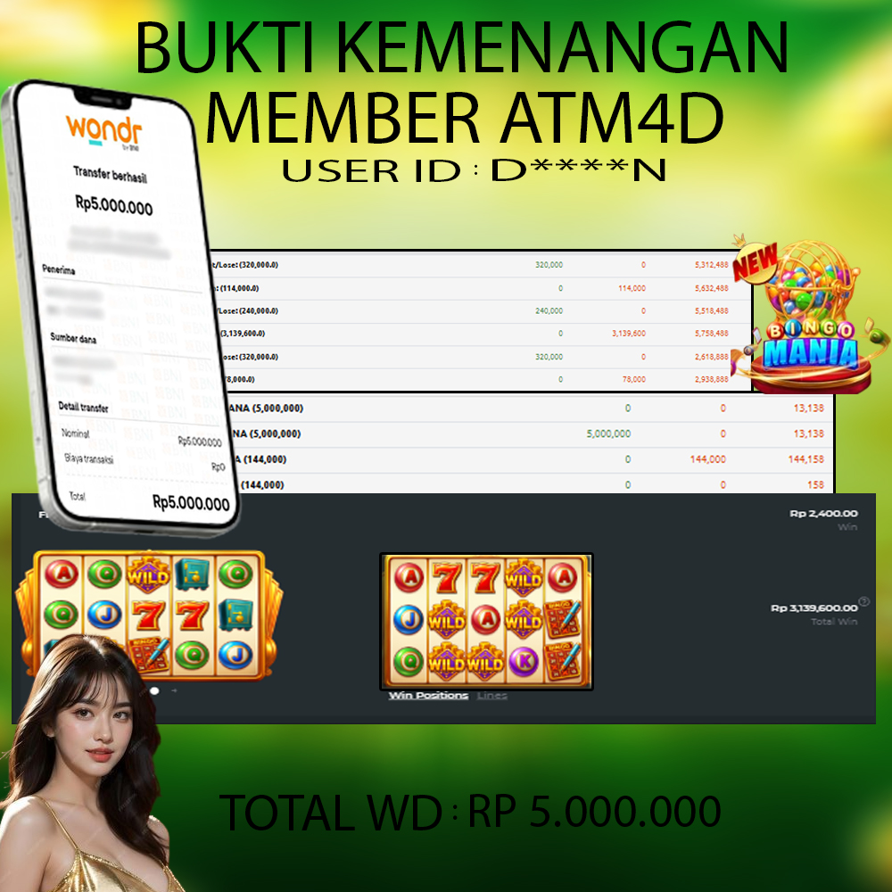Jangan lewatkan kesempatan untuk meraih kemenangan besar. Daftar sekarang di ATM4D dan rasakan pengalaman bermain slot terbaik yang pernah ada! Putar gulungan, menangkan jackpot, dan jadilah bagian dari komunitas pemain sukses kami!