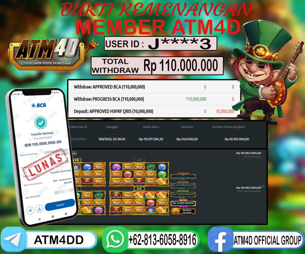 Jangan lewatkan kesempatan untuk meraih kemenangan besar. Daftar sekarang di ATM4D dan rasakan pengalaman bermain slot terbaik yang pernah ada! Putar gulungan, menangkan jackpot, dan jadilah bagian dari komunitas pemain sukses kami!
