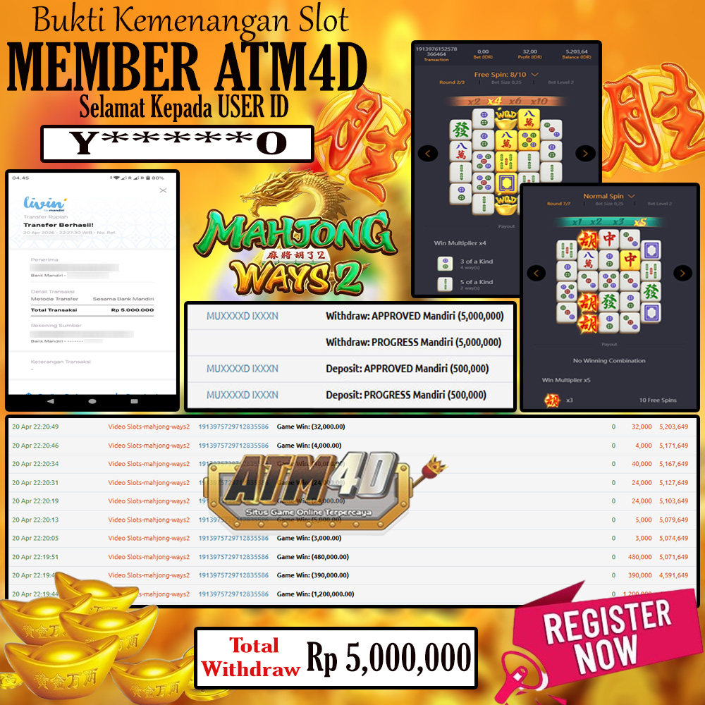 Jangan lewatkan kesempatan untuk meraih kemenangan besar. Daftar sekarang di ATM4D dan rasakan pengalaman bermain slot terbaik yang pernah ada! Putar gulungan, menangkan jackpot, dan jadilah bagian dari komunitas pemain sukses kami!